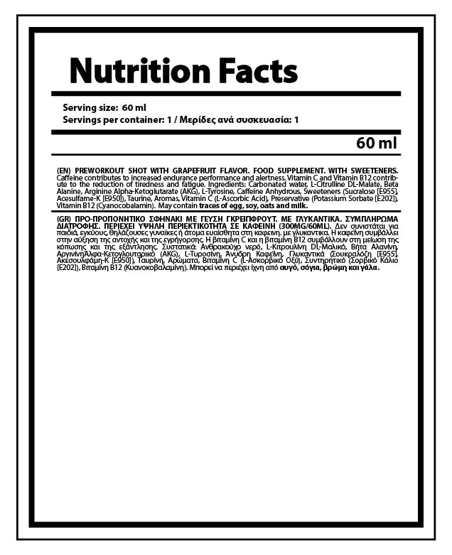Με γεύση γκρέιπφρουτ και ειδικά διαμορφωμένο για να ενισχύει τη σωματική και πνευματική σας απόδοση, αυτό το shot είναι ιδανικό για όσους επιθυμούν να αυξήσουν την ενέργεια και τη συγκέντρωσή τους.